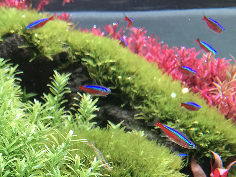 Trong bể thủy sinh, cá Neon thường bơi theo đàn, tạo nên điểm nhấn thị giác nổi bật và giúp tổng thể bố cục trở nên hài hòa, tự nhiên hơn.